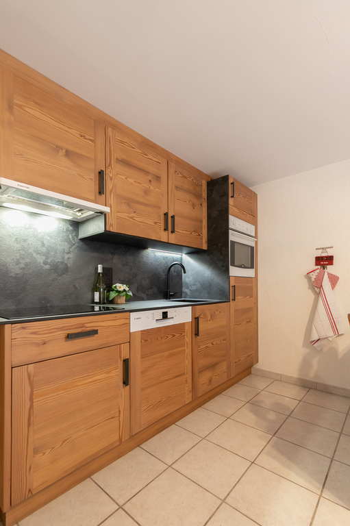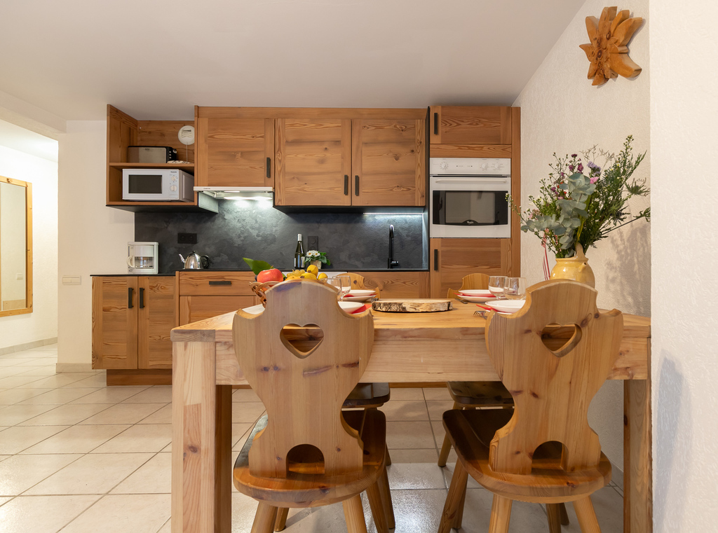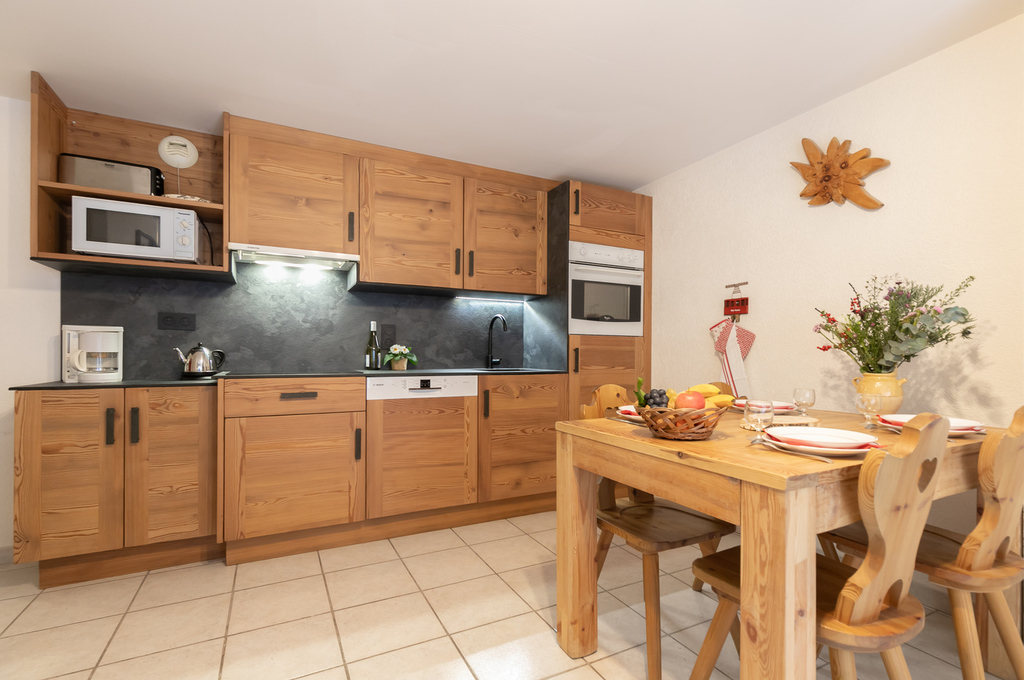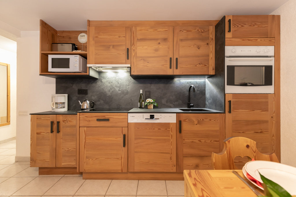 Le coin cuisine dispose d'une plaque en vitrocéramique, d’un réfrigérateur 3*, d'un lave-vaisselle, d'un four électrique, d'un micro-onde et d'une hotte aspirante, deux poubelles pour le tri des déchets.