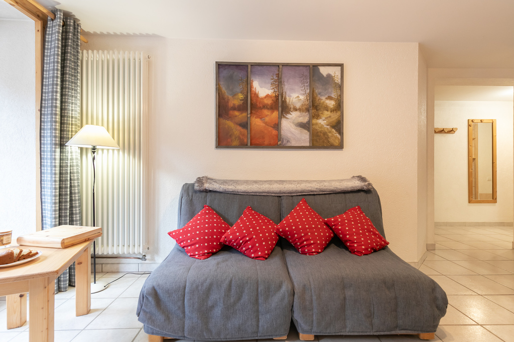 Le coin salon comprend un téléviseur écran plat, un poste radio, un meuble de rangement, une table basse, deux banquettes BZ de 80 (2 oreillers 65 x 65, 2 couettes 140 x 200).