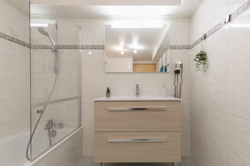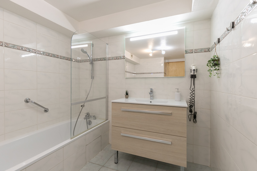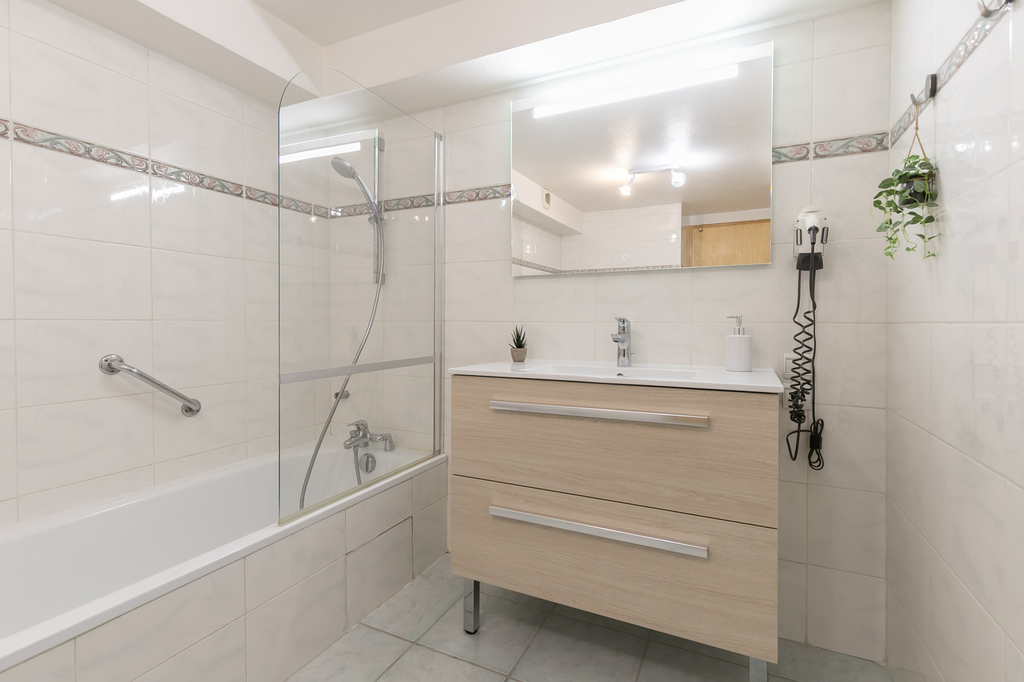 - une salle de bain avec meuble-lavabo, baignoire équipée d'un pare-douche, radiateur sèche-serviettes et WC.